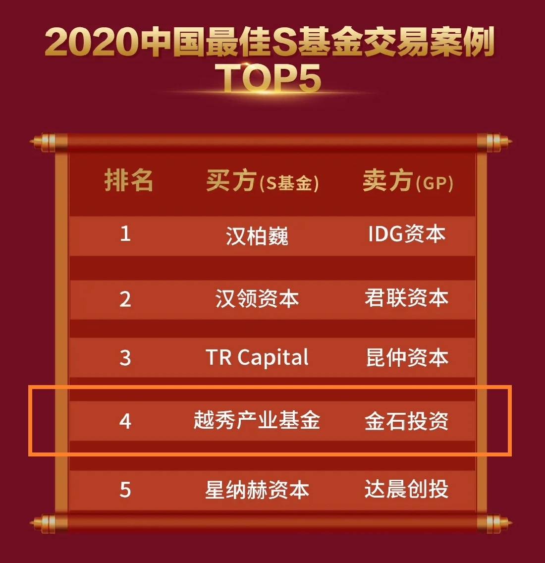 2021年4月18日下午,"2021中国S基金榜单"在中国S基金峰会重磅发布,越秀产业基金凭借专业的市场化母基金运作能力和领先市场的S基金投资实践,荣获“2021中国最佳S基金TOP10”和“2020中国最佳S基金交易案例TOP5”两项大奖。