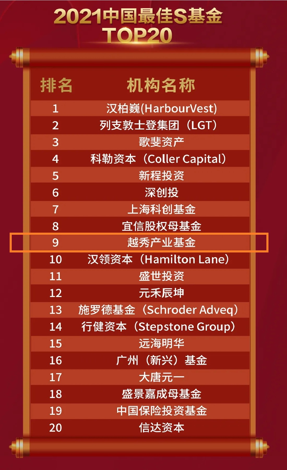 公司荣誉|越秀产业基金荣获2021中国最佳S基金TOP10